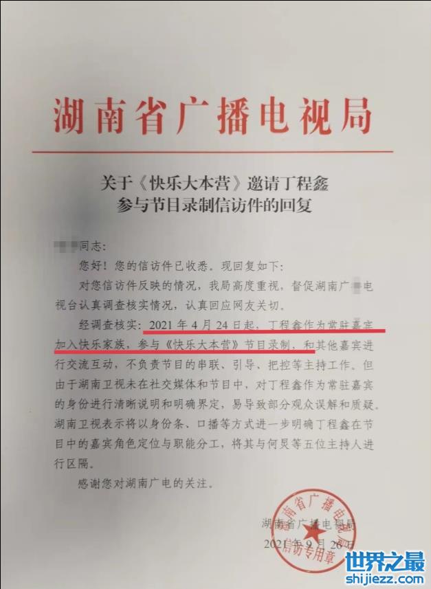 回复中写道“经调查核实,在2021年4月24日起,丁程鑫便作为常驻嘉宾加入快乐家族,参与《快乐大本营》节目录制,和其他嘉宾进行交流互动,但不负责节目的串联、引导、把控等主持工作。”也就是说丁程鑫在《快本》的舞台上并非是主持人,依旧是嘉宾。