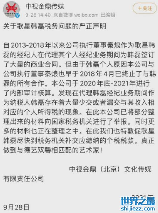 9月28日,一个名为“中视金鼎传媒”的账号发布了一条微博,微博中指出,在公司执行董事秦烺代理韩磊经纪业务期间,作为纳税人的韩磊存在少交或者漏交个人所得税的情况,并称公司已经将材料递交了国家税务机关,对韩磊进行了举报。