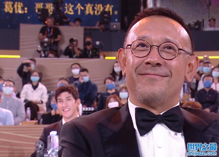 镜头转到台下的姜文,姜文也是害羞地笑了起来。姜文出穿着黑色西装打着领结非常帅气,满脸笑容地看着台上的葛优和陈道明两人“说相声”。