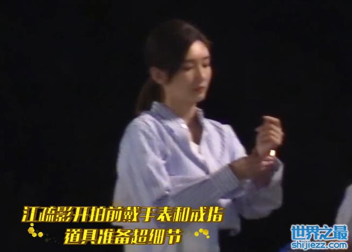 江疏影准备拍戏前,会将角色要用到的手表戒指这些道具都戴在手上,非常注重细节。而且江疏影的表情非常严肃,可以看出她应该是已经入戏了。因为她似乎要演一场夜晚与人争执的戏,需要很严肃的表情。