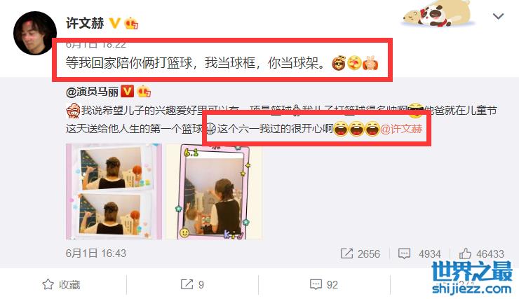 偶尔,马丽许文赫夫妻二人还会在微博上高调秀恩爱,比如六一儿童节那天,马丽晒出和儿子的合照表白老公,随后,许文赫转发并表白马丽:“我回家陪你俩打篮球,我当球框,你当球架”。