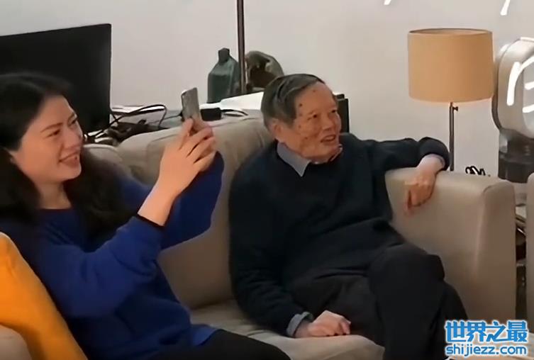 沪剧表演老师王晓云正在表演,杨振宁躺坐在沙发上,翁帆披散着头发,穿着深蓝色毛衣,举着手机拍照,露出甜甜的微笑,与杨振宁二人表情神同步。