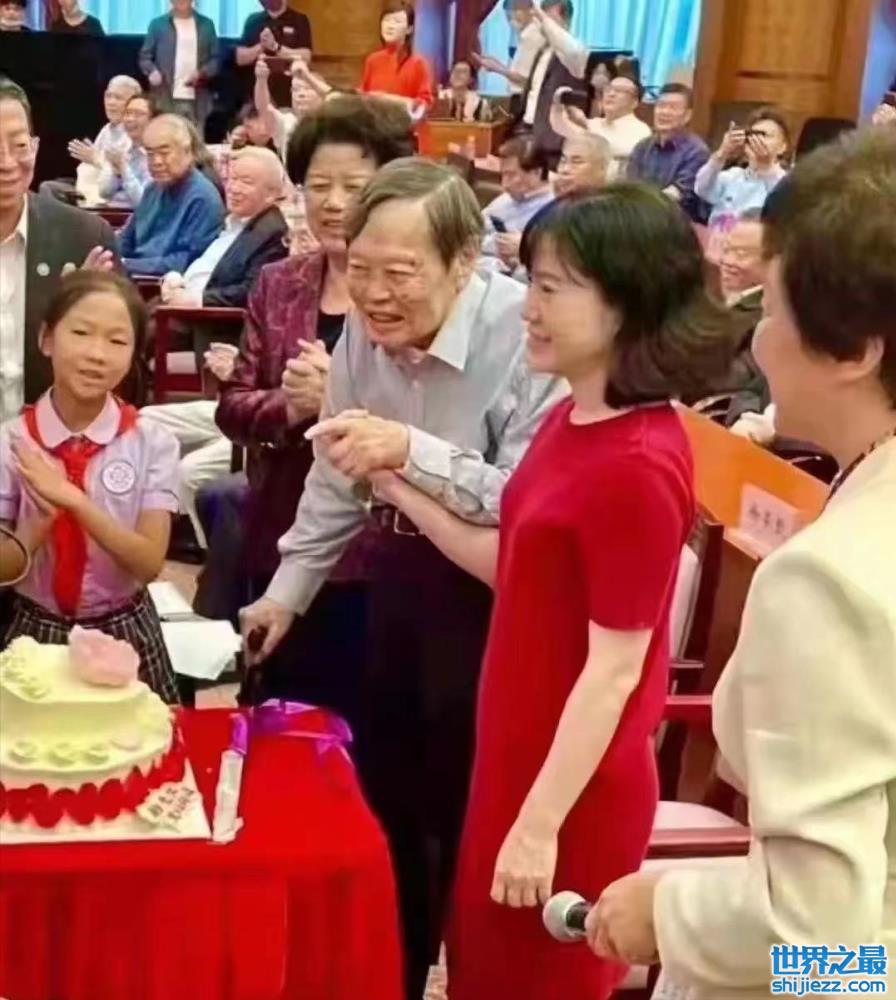 杨振宁生日会现场,翁帆做了新发型,打扮俏皮可爱,杨振宁一直拉着翁帆的手,夫妻二人一同切生日蛋糕。