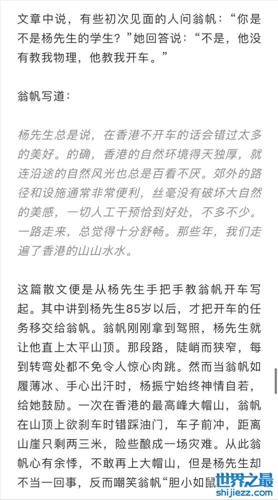 翁帆被问不是杨振宁的学生,回应说:“他没有教我物理,他教我开车”,杨振宁80多岁的高龄,还会教翁帆开车,二人在香港的街头自驾游,一路上欣赏美景。