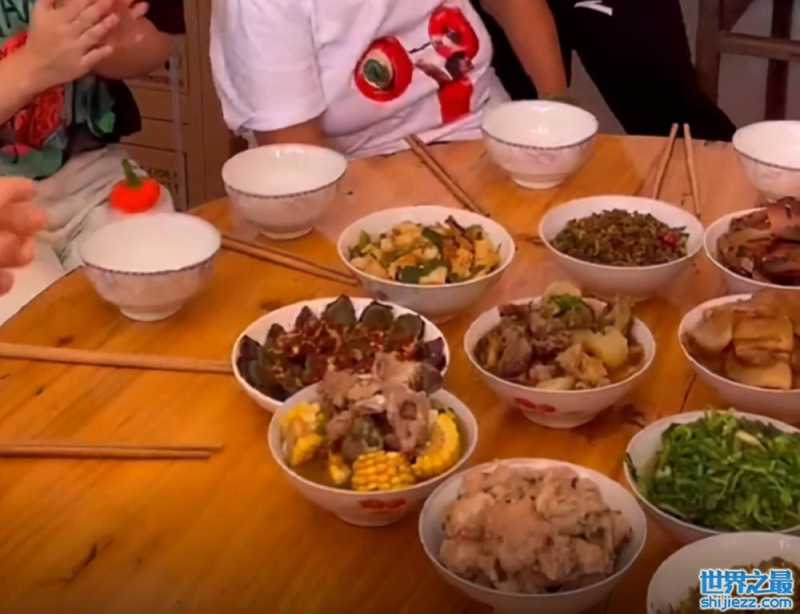 桌椅板凳都相当的朴素,不过迎接冠军回家的饭菜还是很厉害的,简单朴素的圆桌上,满满当当摆放着各种美味佳肴,肉都是超大一块,宴席看起来相当豪华。