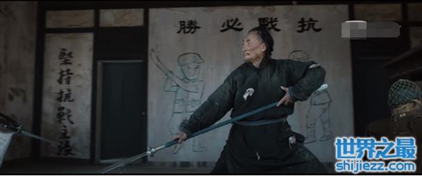 而剧中疯了的戏老板,平日疯疯癫癫,对阵日军时却拿着昔日的红缨枪站得笔直,嘴里一边念唱词,手里一柄红缨枪舞得足下生风。
