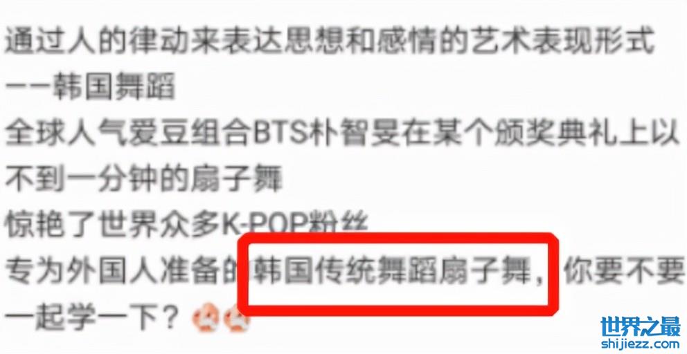 更加令人生气的是,防弹少年团的朴智旻,甚至直接说扇子舞是韩国的传统艺术。