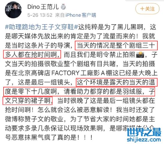 这段视频在网上很快引起激烈讨论,连负责拍摄这段短片的导演也发文为王子文澄清,他表示拍摄这段广告时已经是深夜,所有人都在抢时间,助理帮她穿鞋也是为了节省时间。而且他反复强调王子文在片场非常敬业,零下十几度穿着短裙也面不改色。