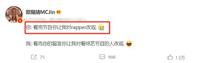 欧阳靖作为一个说唱歌手,不管是在日常生活还是在节目中都十分是有趣,打破了大家对于说唱歌手又酷又飒的刻板印象。就连他自己也在社交平台调侃,大家在看完他近期参加的综艺节目之后对于说唱歌手的观念发生了改变。