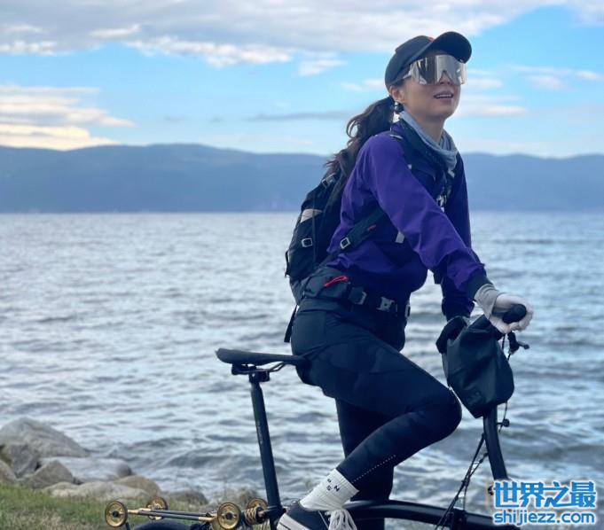 一个人的路也可以很精彩,张静初最近分享了旅游照。照片中的她穿一件紫色卫衣,将卷发绑在脑后,看起来很潇洒。她一边踩着脚踏车,一边观赏蓝天湖水连成线的美景,能感受到她内心的自由自在。