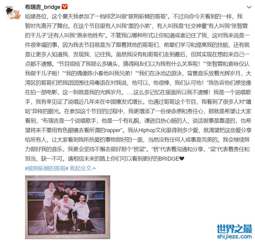 陈小春阵营中的布瑞吉,这次在四公被淘汰了。布瑞吉在之后发布长文告别《棘哥》,希望大家不要戴着有色眼镜去看rapper,布瑞吉是一个说唱歌手,也是一个很热心很有礼貌的人。