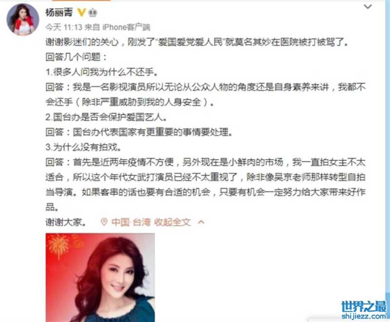 原来是杨丽菁在个人账号上发表了一些爱国爱民的言论。当时的她在发文之后就收到了一些人的警告,但她不以为然,还表示作为中国人不爱中国爱哪里?我拍过很多中国警员的电影,第一条就是要爱国爱民。