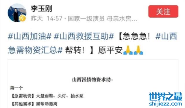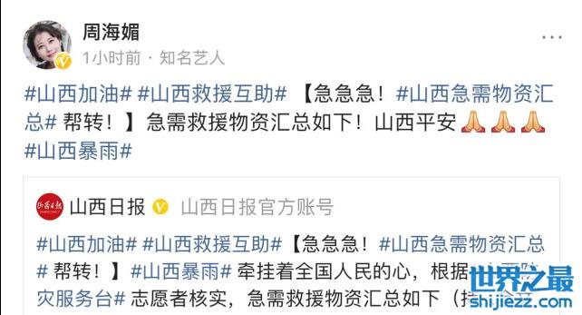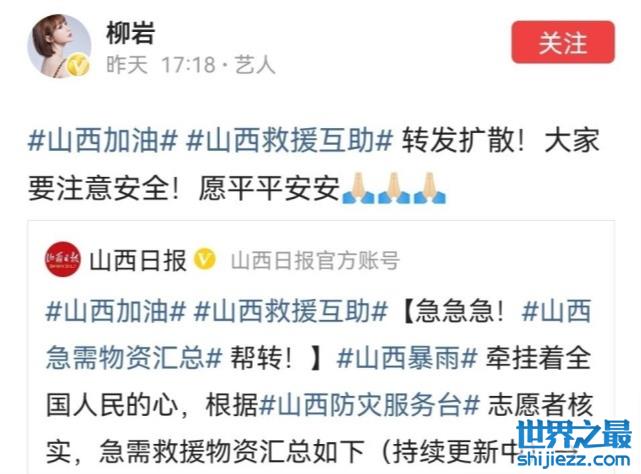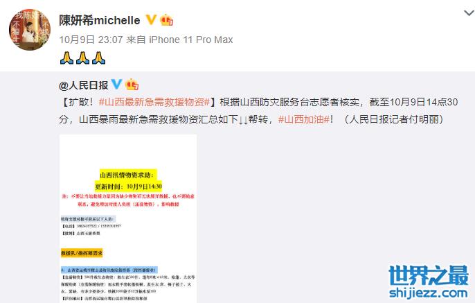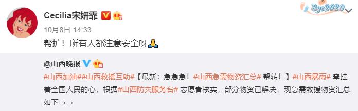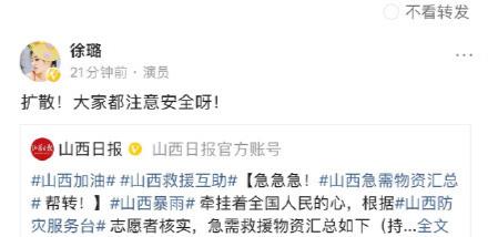 另外,不是山西籍的艺人也纷纷为山西祈福并转发物资求助动态,陈妍希深夜11点还在关注山西最新急需救援物资情况,黄晓明早在10月7日就为山西祈祷平安,也希望更多的人帮助山西度过难关。宋妍霏、李玉刚、柳岩、徐璐、刘敏涛、周海媚、也一起为山西祈福,很感谢这些艺人能够在第一时间发声,传递着爱的能量。