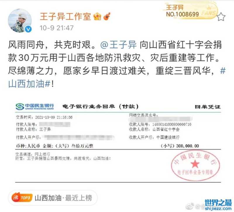 王子异是第一个山西籍捐款的艺人,也带动其粉丝也加入到捐款的队伍中,不少粉丝已捐出不少钱,这就是偶像正能量的力量,都是好样的。
