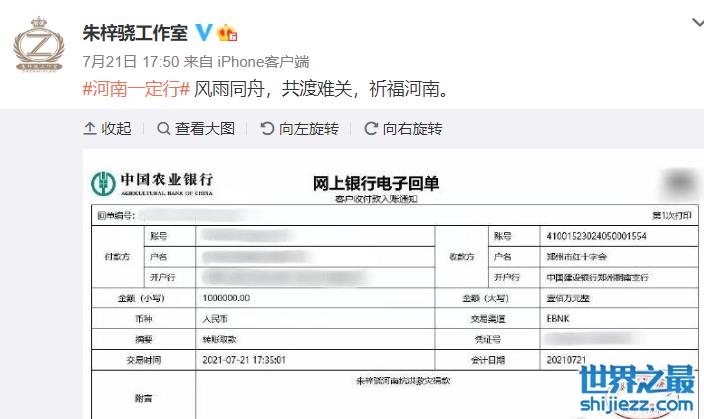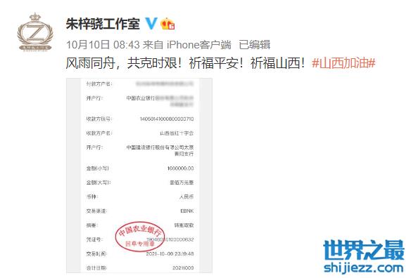 朱梓骁工作室晒出了捐款的回执单,向山西省红十字会捐款100万元,工作室发文称“风雨同舟,共克时艰!祈福平安!祈福山西!”