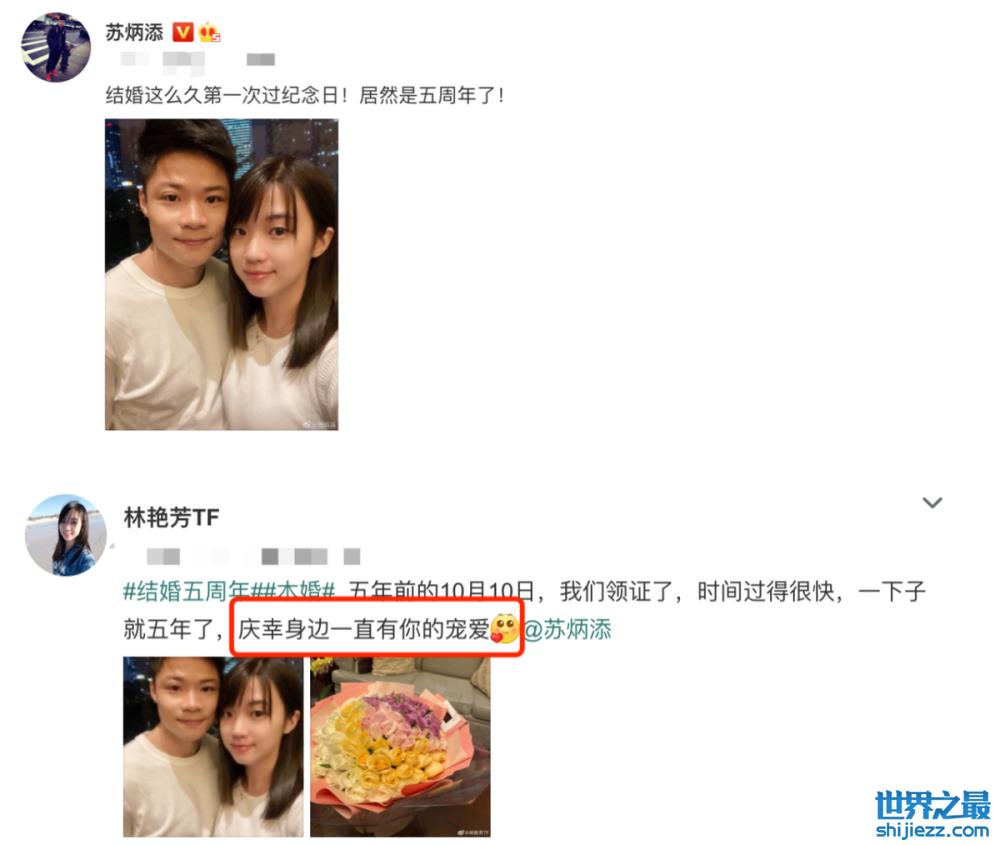 近日,苏炳添在个人社交平台上晒出了自己与妻子林艳芳的合照,并配文表示这是结婚以来第一次过纪念日,两人结为夫妻已经五年了。随后妻子林艳芳也发文表白苏炳添,庆幸一直以来身边都有丈夫的陪伴,言语之间可以看出两人非常的恩爱。