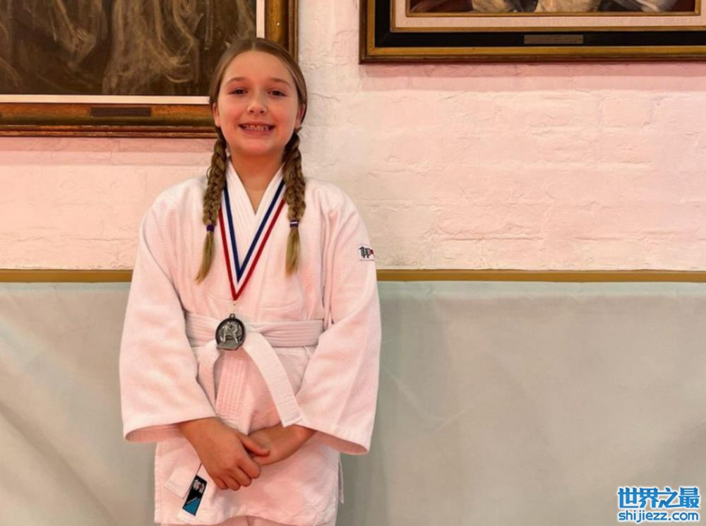 画面中,小七身穿白色的柔道服,头发扎成了两个麻花辫,胸前挂着比赛获得的银牌。面对镜头时,小七端端正正地站着,双手交握在腰前,咧嘴露齿微笑,看起来有些不自然和拘谨。