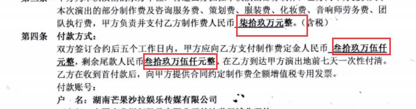 从曝光的内容可以得知,2018年12月28日,韩磊受邀参加地方电视台的演出活动,演出费用为90万元,为了能避免缴纳税款,经纪人苏玉介入此事,明面上将韩磊的演出费用更改成20万,而韩磊所收取的70万则为了逃避税款蓄意拆分成两份合同,也就是我们常言所说的“阴阳合同”。