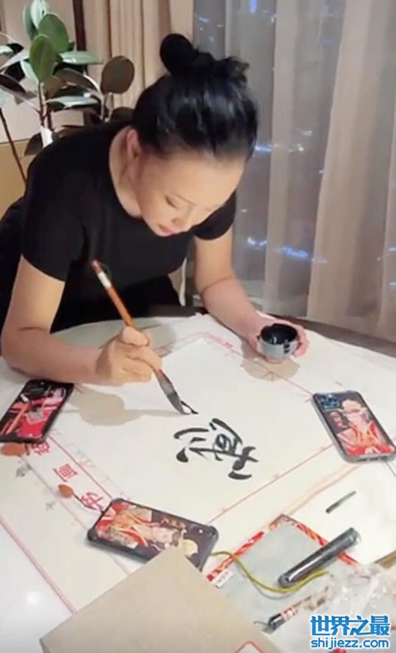 除了做运动之外,刘晓庆老师平时还喜欢练练书法。只见刘晓庆老师拿着毛笔一脸认真地在纸上写着“感恩”二字,握笔姿势专业,写的字也非常美观,据说刘晓庆老师还曾售卖过自己的字画,看起来水平很高。