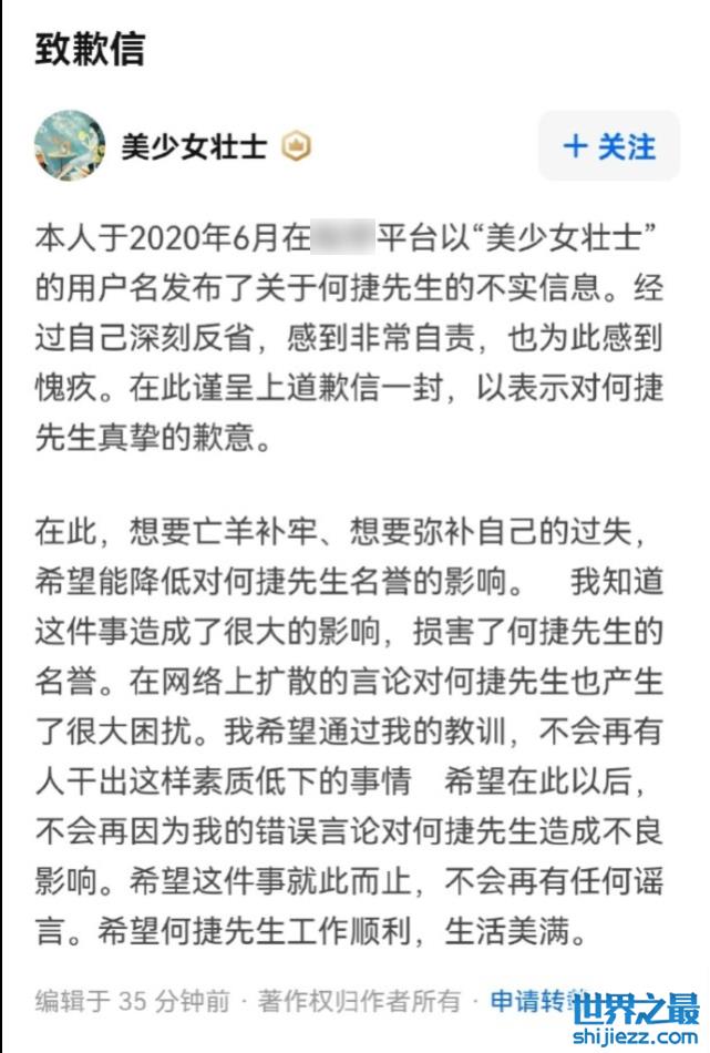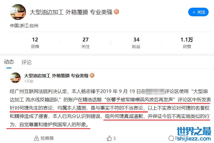 10月12日,一位本名叫“杨志锋”的网友发布动态公开致歉,声称自己凭空揣测从而用言语中伤何捷,导致对方名誉权与精神造成了侵害,可以看出,当时这位网友在精选话题“张馨予被军嫂嘲讽风波后再发声”的话题下发表不当言论,吐槽何捷参加综艺有损军人形象,因为逞口舌之快从而导致当事人无辜受害。