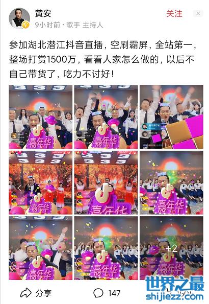 如今的黄安,也开始直播带货,最近更是在某社交平台的网红直播间里,获得了全场1500万的直播打赏,成为了同时段全站第一。在网红直播间里,黄安一边演唱自己的代表作品,一边带货推荐小龙虾,忙得不亦乐乎。