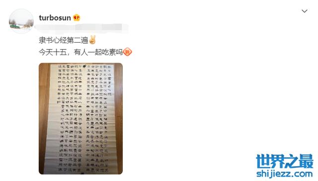 孙俪还会定期抄写一些静心养神的书法以及吃素,从她分享的动态来看,她已经保持这种习惯很久了。