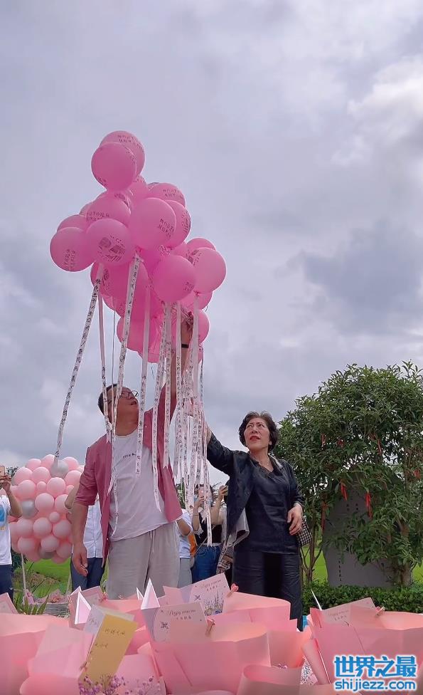 乔爸爸和乔妈妈一同将粉色气球放飞,只见每一个粉色气球上面都写了文字,气球下面还带着写满字的白色纸条,这想必是乔任梁的粉丝和朋友们对他的问候,希望通过气球能传递给天上的乔任梁。