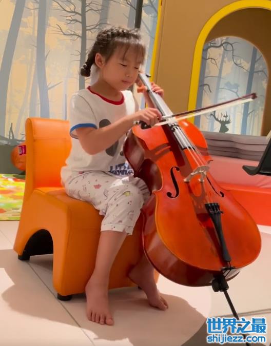 小女儿岳麓玥也很是多才多艺,年纪轻轻就会拉大提琴,穿着睡衣坐在椅子上踮脚拉大提琴的样子十分的软萌可爱。