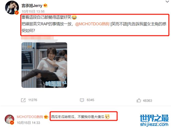这一场面在经过网友的广泛关注与热议之后,言承旭本人也在社交平台发文调侃画面好笑,与此同时他还艾特了热狗,笑问他当女主角的感受如何?随后,当事人热狗也在评论区以一段经典的土味情话回应了言承旭。