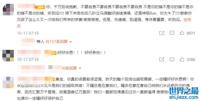 张杰的歌迷们也纷纷跑到评论区留言。粉丝们都说让张杰不要自责,在当时摔下来之后马上调整好状态继续演唱也丝毫没有影响歌唱质量,希望张杰先养好身体,张杰和粉丝双向奔赴的爱也是很暖心。