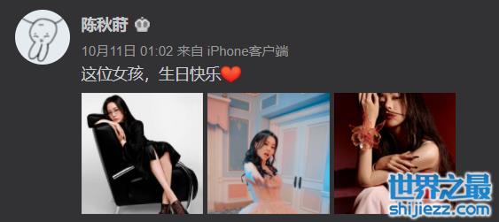 有圈内好友留言调侃陈秋莳发得有点晚,陈秋莳却说自己给张靓颖的祝福形式不止书面表达,瞬间被秀了一脸恩爱。