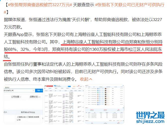除此之外,张恒名下关联的两家公司,其中上海鲸谷座人工智能科技有限公司由郑爽和张恒分别持股68%和32%,今年3月,郑爽所持有该公司的1360万股权被冻结。