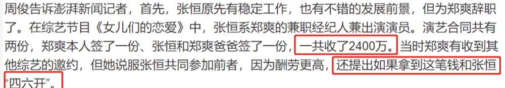 此前,张恒与郑爽在经济纠纷中还提到,之前张恒陪同郑爽参加综艺,本应该分走2400万的节目酬劳,当时两人协商的是“四六开”,按照张恒的说辞郑爽应该支付其960万,但事后郑爽独吞了这笔款项。