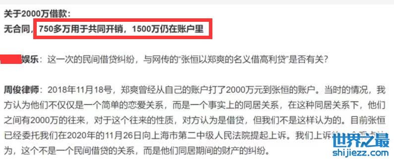 从此前张恒律师接受采访时公布的信息得知,2000万借款除却此前张恒与郑爽共同花费的生活开支之外,有1500万仍在张恒的账户里,目前已经被冻结。
