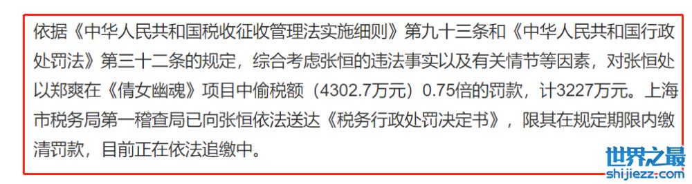 某爽因此受到了相应的惩罚,张恒也难逃干系,最终被处以偷逃税额(4302.7万元)0.75倍,也就是3227万元的罚款!张恒还必须在规定的期限内缴清罚款,否则后果自负。