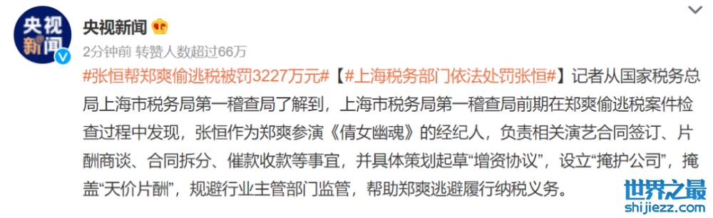 10月18日,又一条关于张恒的消息来了!张恒帮某爽偷逃税被罚3227万元!因为在某爽拍摄《倩女幽魂》时,张恒是某爽的经纪人,负责合同签订、片酬商谈、合同拆分等事宜。而某爽之所以能得到天价片酬,也是因为有张恒的大力协助。