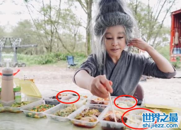 值得注意的是,刘晓庆桌上有三盒盒饭,旁边还有四个小菜,加起来有十几样菜式,看起来还挺丰盛的样子。刘晓庆吃饭的时候也没有换下假发和戏服,看起来拍摄时间应该是很紧凑的。