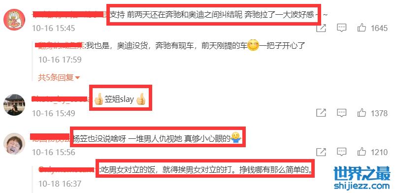 而奔驰作为汽车品牌,其受众群大多是男性,让杨笠为其宣传推广,着实戳到了不少男性的痛点,围观一下网友杂七杂八的评论,可以看出大家的言论两极分化尤为明显,部分男网友对杨笠进行痛斥与攻击,对她的厌恶之感溢于言表,而大部分女网友对杨笠则表示力挺,认为她勇敢说出广大女性的所感所想。