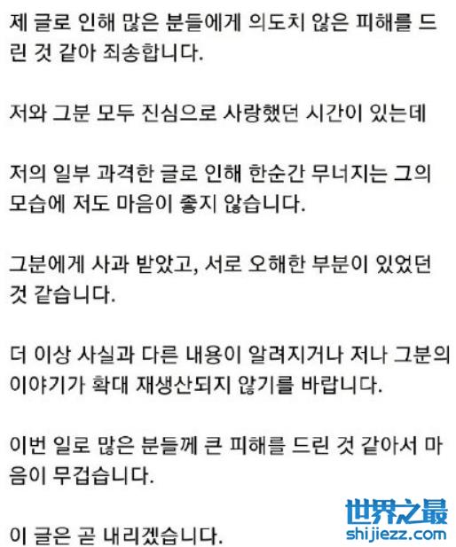 与此同时,前女友还表示,希望大家不要再传播与事实不符的内容,或者是她或金宣虎的故事被夸大和扭曲。因为这件事给很多人都带来了很大的损失,让她感到心情很沉重,表示马上会删除文章。