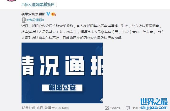 10月21日传来李云迪嫖娼被抓的消息,此后朝阳警方也证实了此消息,并且通过官方渠道和北京平安官方账号一起发文。
