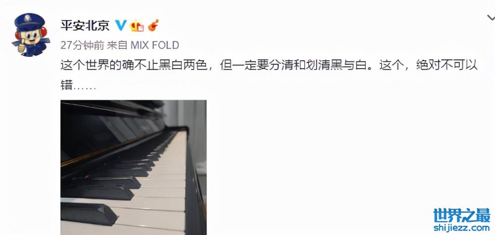 北京平安方面形容世界里不止有黑白两种颜色,一定要划清黑与白,这个绝对不可以错。并且配上了一架钢琴的图片。