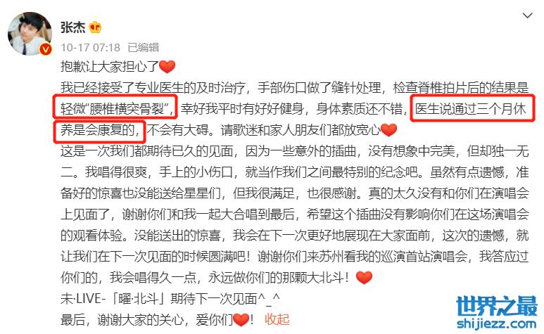 在张杰受伤后的第二天本人就发文回应了自己的伤势。在张杰的回应中他表示自己是轻微的腰椎横突骨裂,医生说需要静养三个月才能康复,除了说明自己的伤势,张杰更多的是对粉丝感到抱歉。