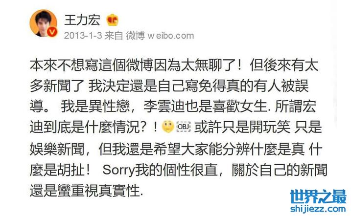 事实上,王力宏早在2013年就已经发文澄清过自己是直男,还说了李云迪也喜欢女生,不清楚绯闻是怎么传出来的,但希望大家能分辨什么是真的,什么是胡扯!