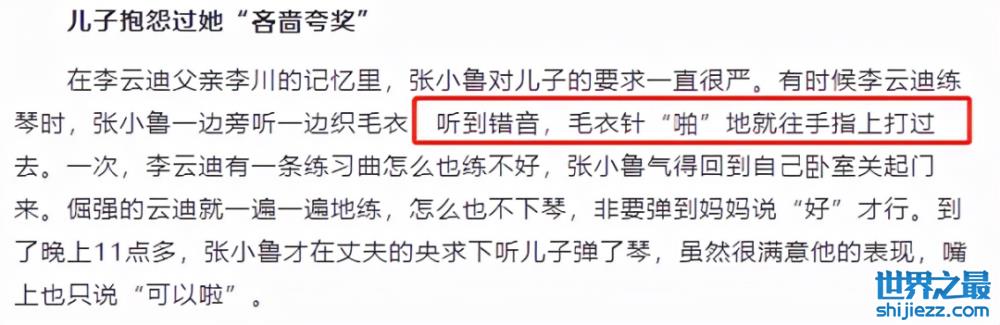妈妈也会在一旁监督李云迪,如果李云迪走神分心了,妈妈就会拿织毛衣的针敲打李云迪的手指。