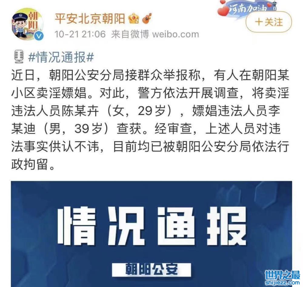 据北京警方通报,朝阳公安分局接到群众举报,将卖淫违法人员陈某卉和嫖娼违法人员李某迪查获。
