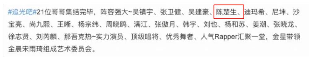 其实不少人都知道,很多节目的嘉宾名单都是按咖位拍的。而这次在《追哥2》的名单里,陈楚生排在了第四位,仅次于吴建豪,可见份量是不低的。但是有趣的是比起刘也、姜潮、尚九熙等人,如今可能大多数网友都认识前三位,却少有人再记得这位曾经火遍全国的冠军。
