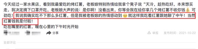 据王楠所说,自己是偶然路过这家水果店,看到有自己最喜欢的烤红薯,老板娘特别热情给她拿个凳子说“天冷,趁热吃好”。本来想买走,但她决定摘下口罩开吃。老板娘认了出来,与王楠吃着红薯聊到了中午,王楠觉得红薯吃在嘴里,暖在心里。