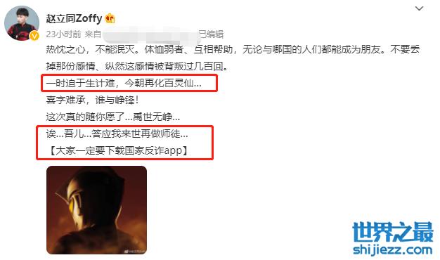 前一晚前一天,身为他的师傅赵立同突然在社交平台上发文,透露了徒弟韩禹峥去世的噩耗。文中写下这一段话“一时迫于生计难,今朝再化百灵仙。喜字难承,谁与争锋!这次真的随你愿了。吾儿,答应我来世再做师徒。”让人不禁泪下。此外赵立同还在结尾处还提醒各位网友要一定要下载反诈软件。
