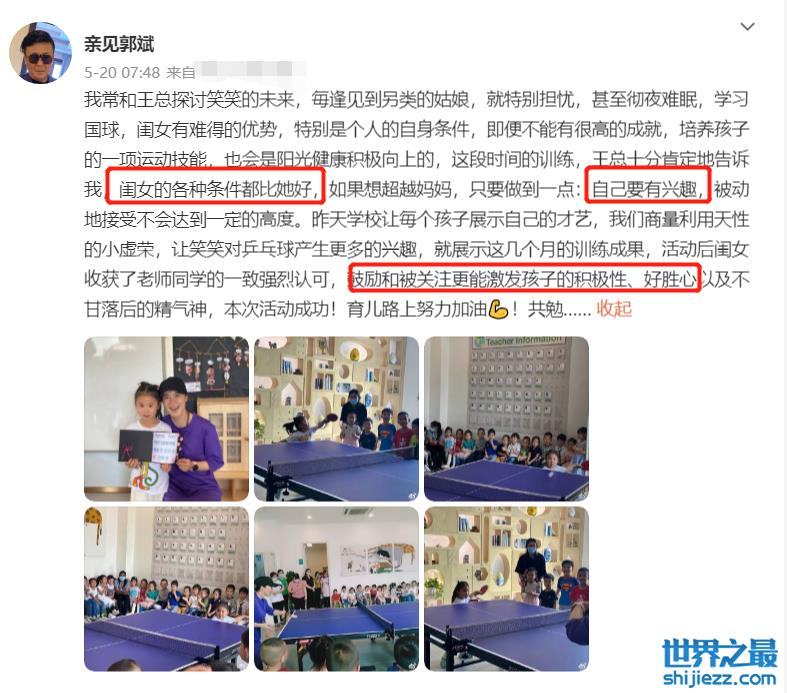 除了培养自己的儿女打乒乓球之外,夫妻二人也在为乒乓球事业做出自己的贡献。前不久郭斌还收到了中国乒乓球协会的感谢信。