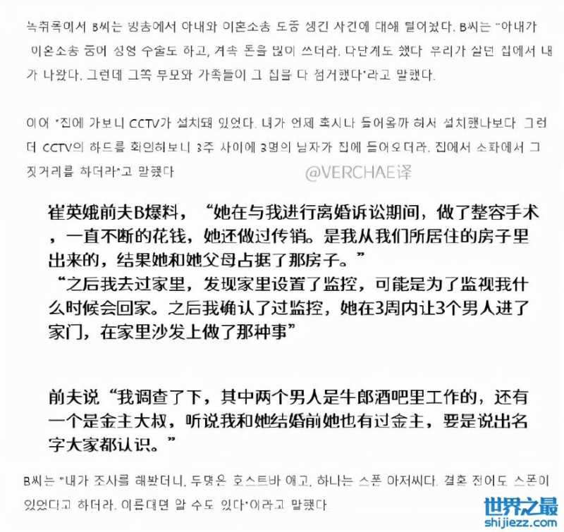 崔英娥前夫的爆料更是让人瞠目结舌,前夫称崔英娥和她的父母占据了两人的房子,崔英娥还在家里安装了监控,为的就是监视他什么时候回家。结果前夫在监控里面发现,崔英娥在3周内让3个男人去了家里,并发生了关系,其中两人为牛郎一人为金主,还爆料崔英娥在与他结婚之前就有金主,而且这位金主很有名。